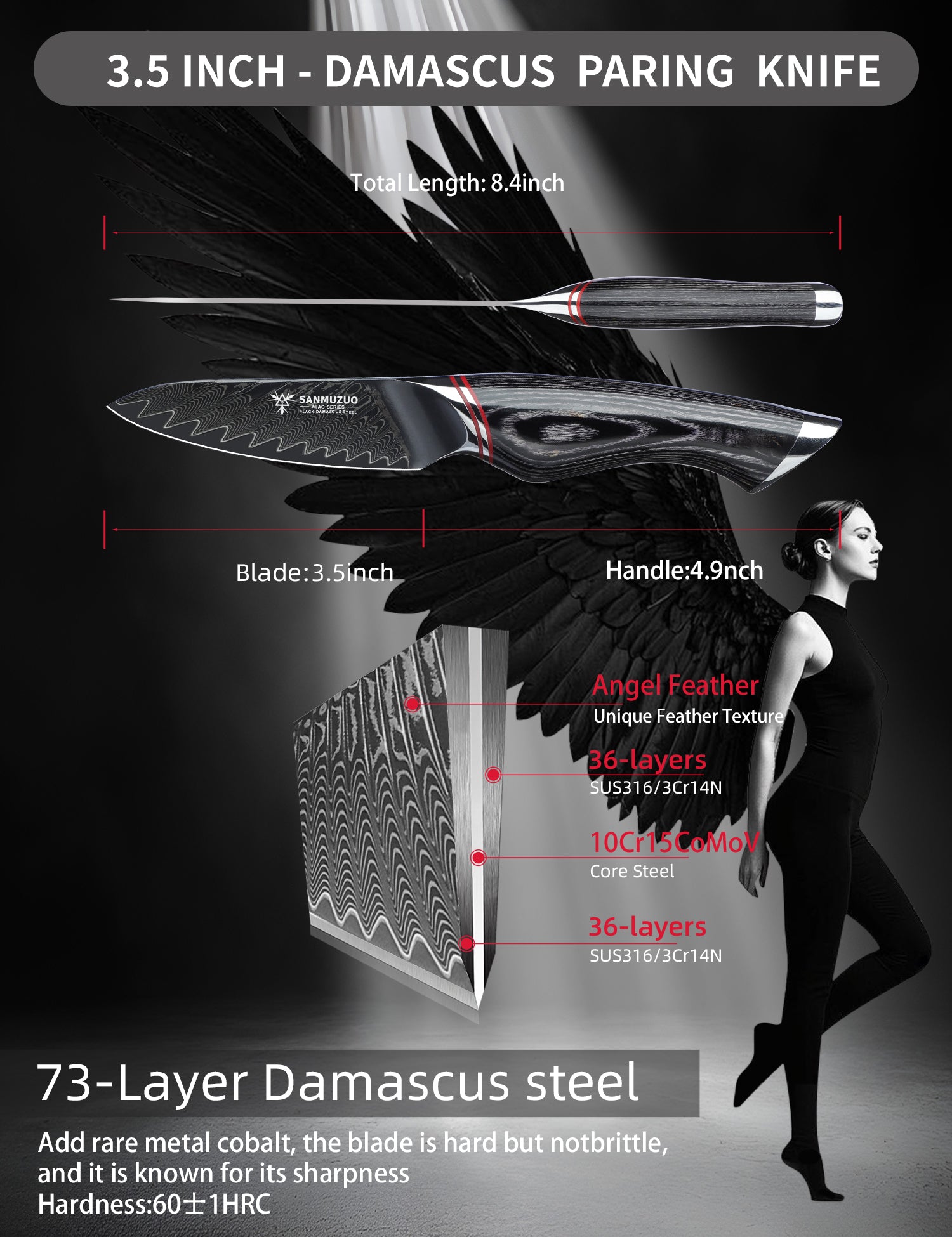SANMUZUO 3.5 Inch Paring Knife - Fruit and Vegetable Peeling Knives, Black Damascus Steel with Ergonomic Handle - MIAO