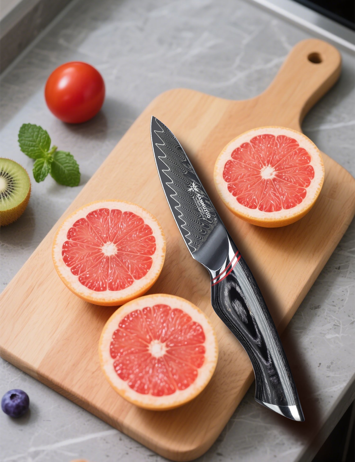 - Black forged 73-layer Damascus steel, cryogenically treated with liquid nitrogen, and featuring a 15° ultra-fine edge.