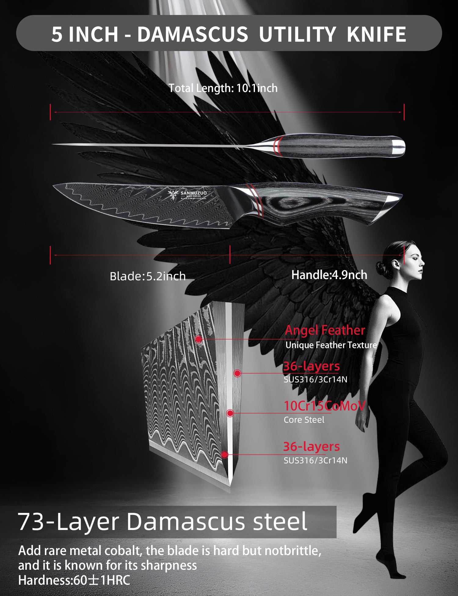 SANMUZUO 5 Inch Utility Knife - Fruit and Vegetable Knives, Black Damascus Steel with Ergonomic Handle - MIAO Series