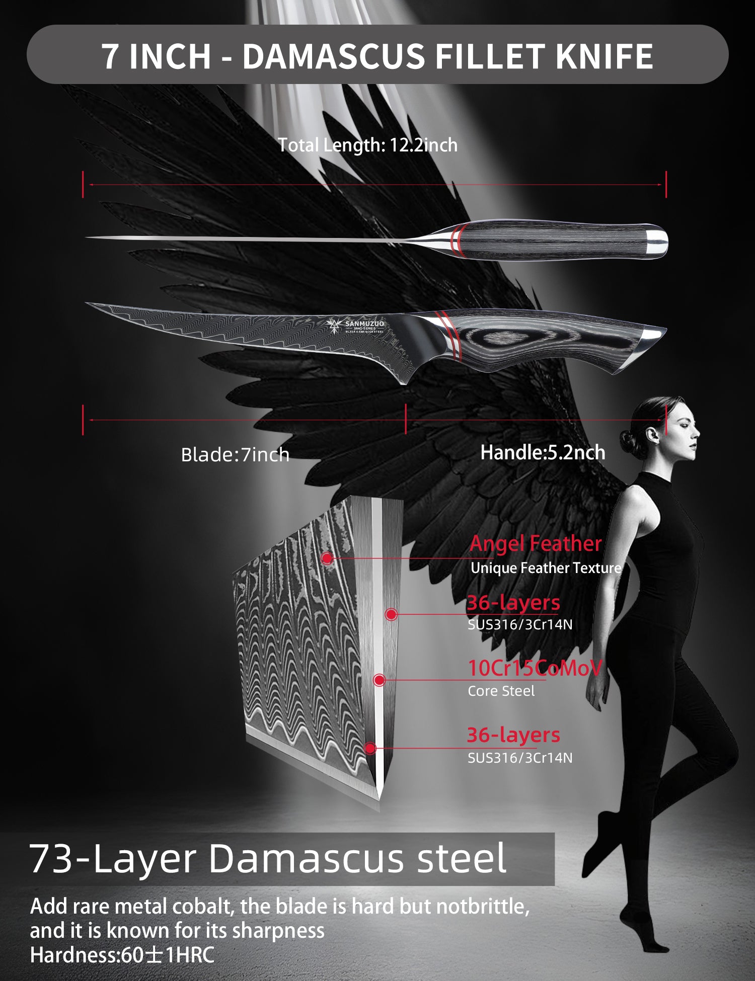 SANMUZUO 7 Inch Fillet Knife - Professional Kitchen Boning Knife - Black Damascus Steel with Ergonomic Handle - MIAO Series