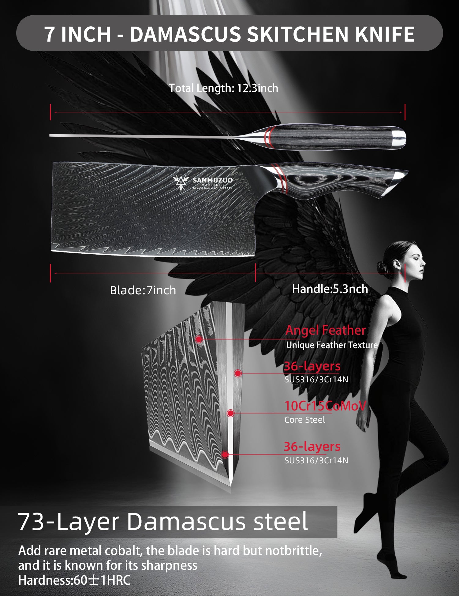 - Black forged 73-layer Damascus steel, cryogenically treated with liquid nitrogen, and featuring a 15° ultra-fine edge.