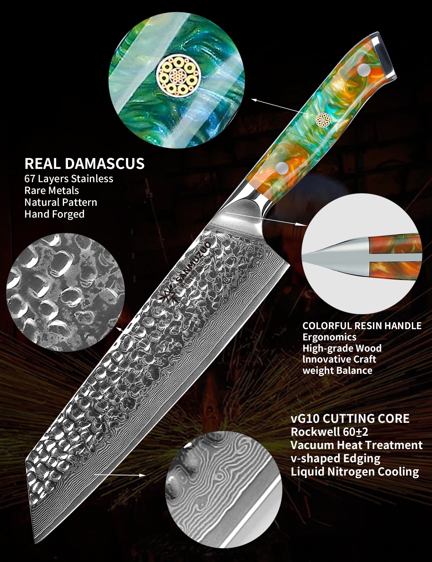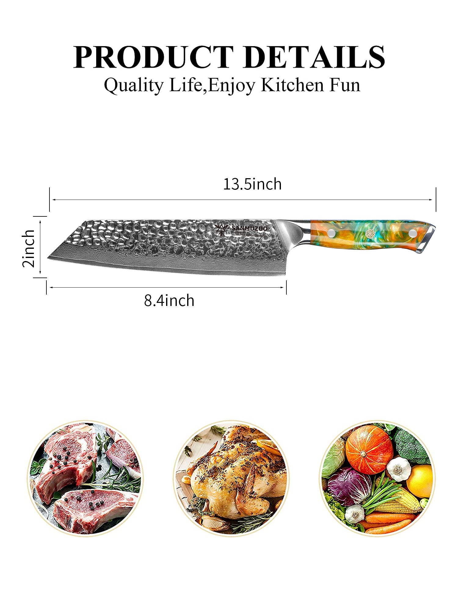 - ✔AMAZING RESIN HANDLE: The classic perfectly designed handle combined with a luxurious resin material, mirror finishing makes the resin's colorful properties exceptionally dazzling, while being long last, providing excellent control, flexibility and comfort for any hand. With the SANMUZOU's Knife in hand, there is no need to worry about your hands getting tired or sore.